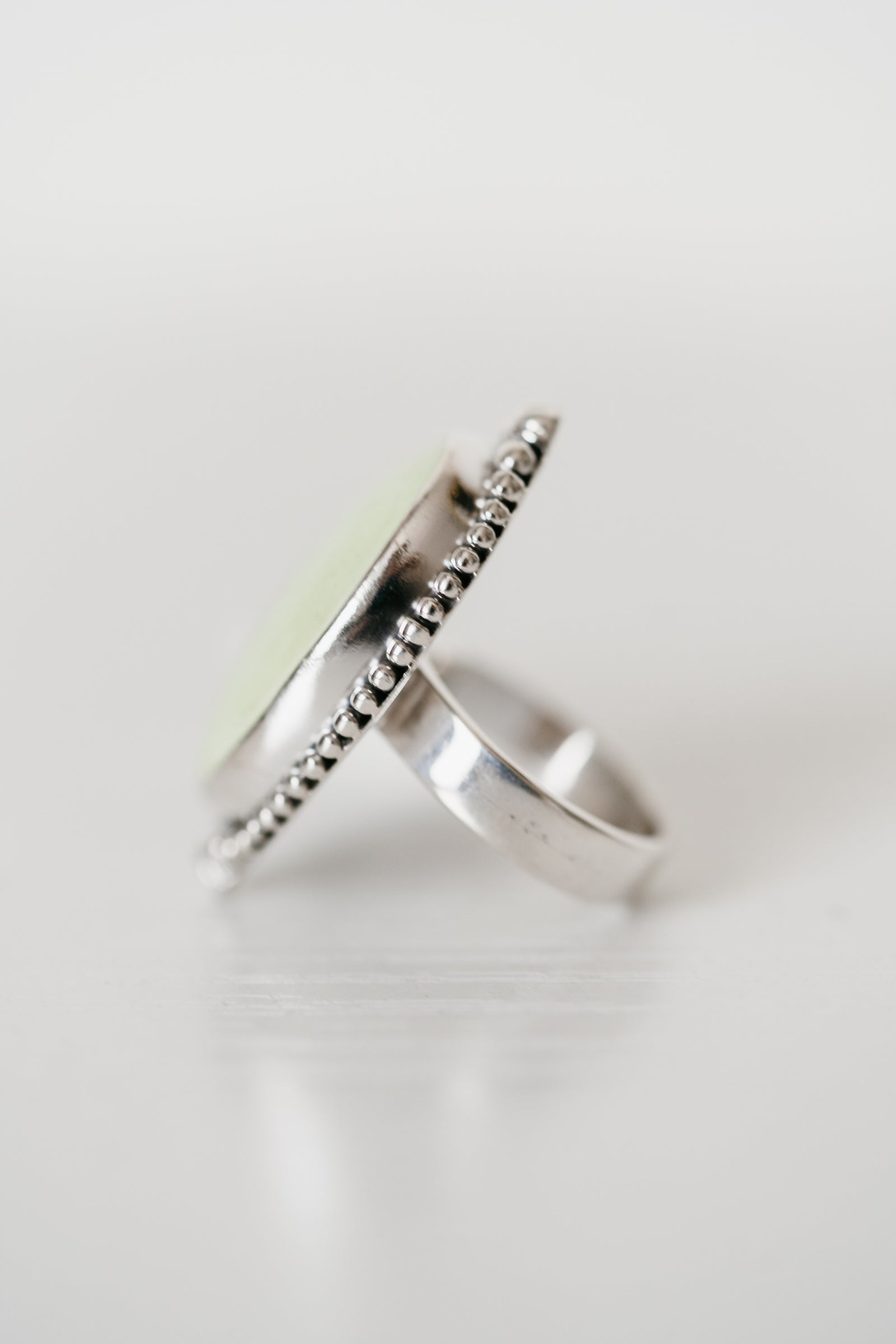 - Silver dot detailing that encompasses the entire stone