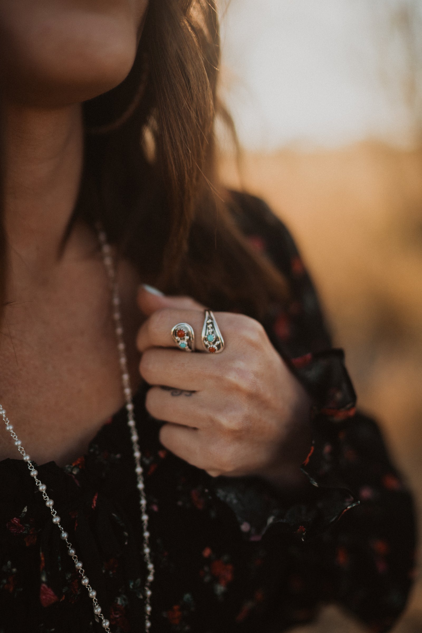 Adjustable Coral and Turquoise stones set into sterling silver. One size fits all! Simple, dainty, stunning.