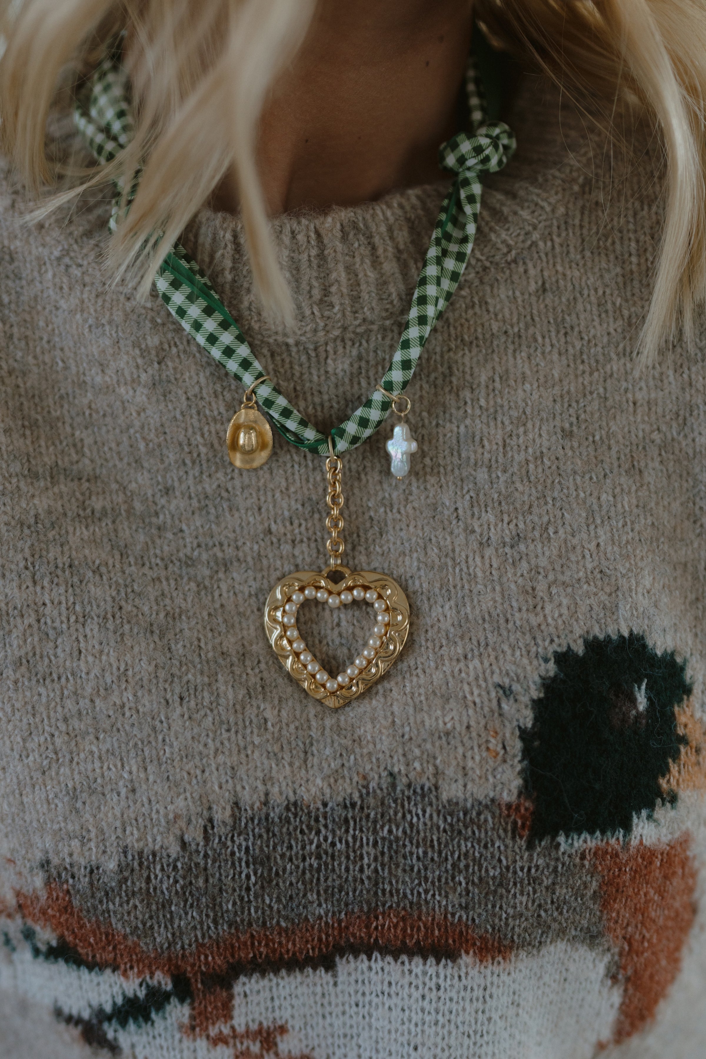 - 3 pendants total - matte gold cowboy hat, gold filled Pearl, and gold plated heart