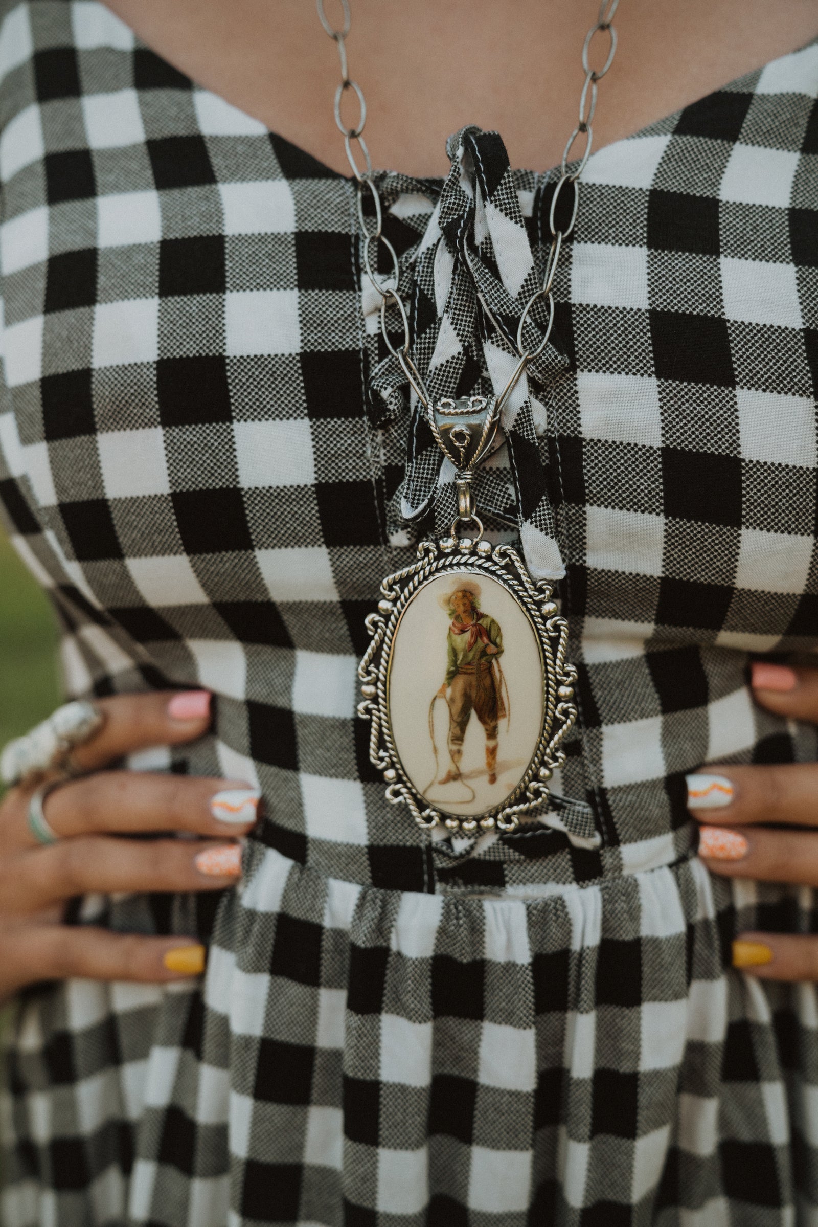 Stunning vintage dish Cowgirl pendant on our favorite Silver Shelly Chain! The pendant is a bubble style. Chain measures 26 inches, but is adjustable!