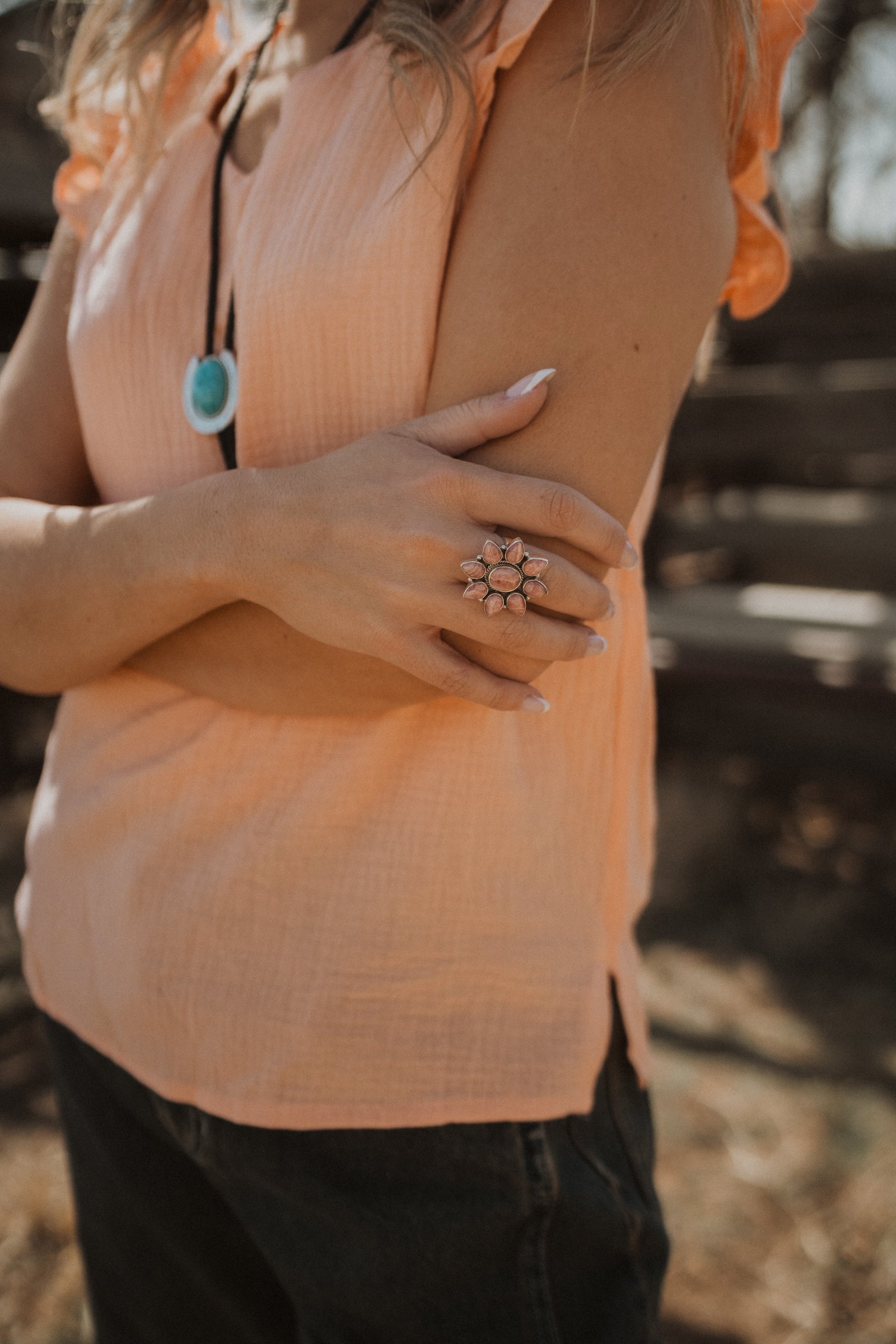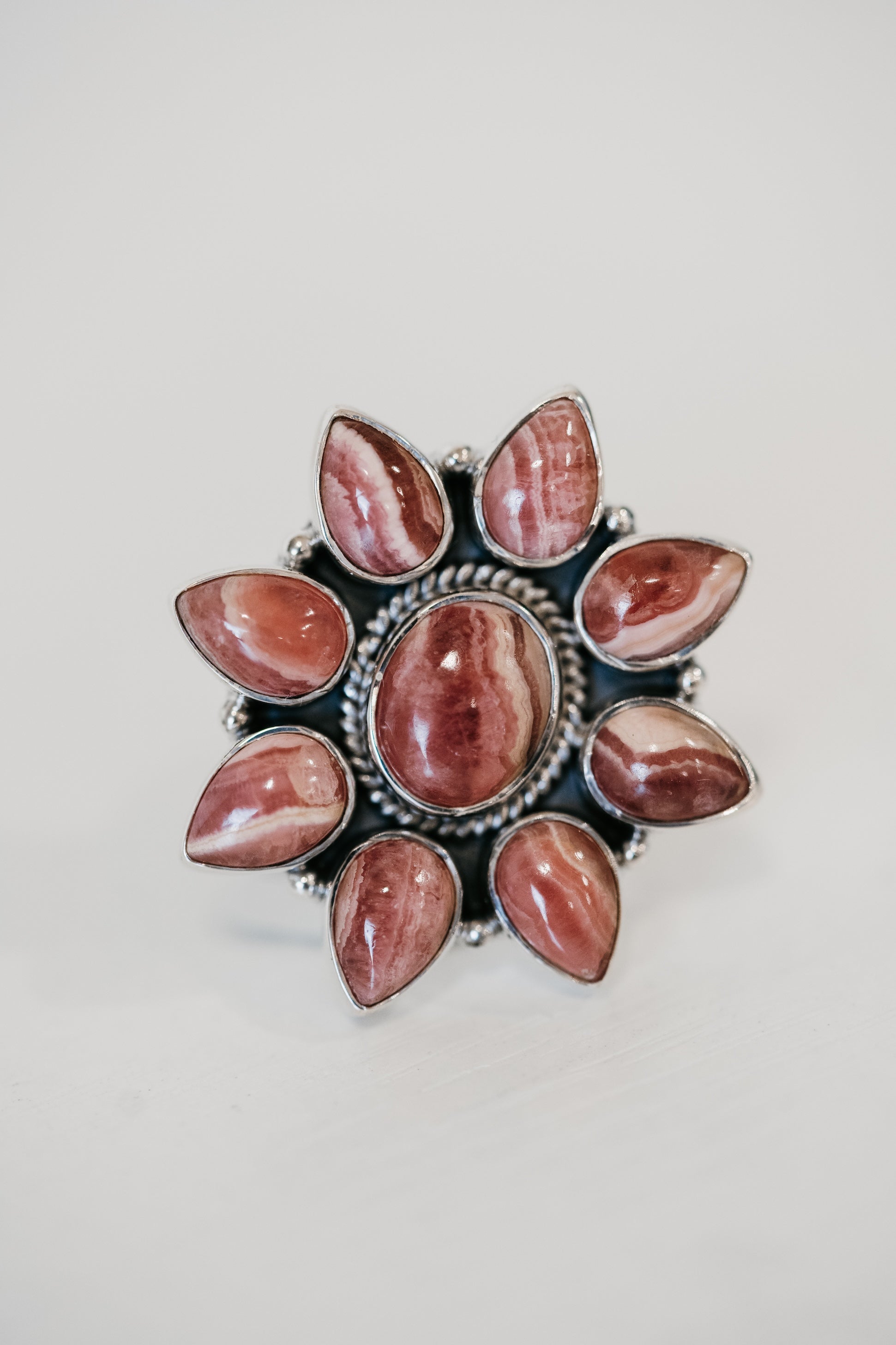 - Flower shaped formation made out of teardrop outside stones and oval center stone